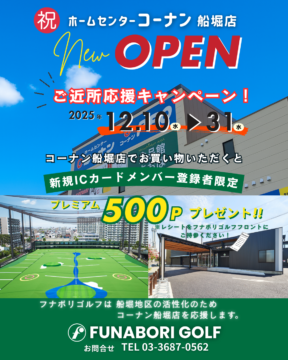 12/10(水)フナボリゴルフの向かいにコーナン江戸川船堀店がオープンします。 フナボリゴルフではオープンを記念して新規入会キャンペーンを実施します。 コーナンのレシートをご提示いただきフナボリゴルフの新規メンバーにご登録されたお客様には、…続きを読む