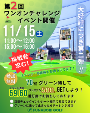 前回好評を頂きました「ワンオンチャレンジイベント」を今月も開催します。 2階打席から70ヤード先のグリーンを狙って1球限りのチャレンジ! 見事ワンオンに成功したらプレミアムポイント500ポイントをプレゼントします。 初心者でもOKです。無料…続きを読む