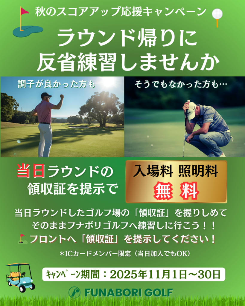 11月1日から30日までの1ヶ月間、ラウンド当日にご来場されると入場料・照明料が無料になります!